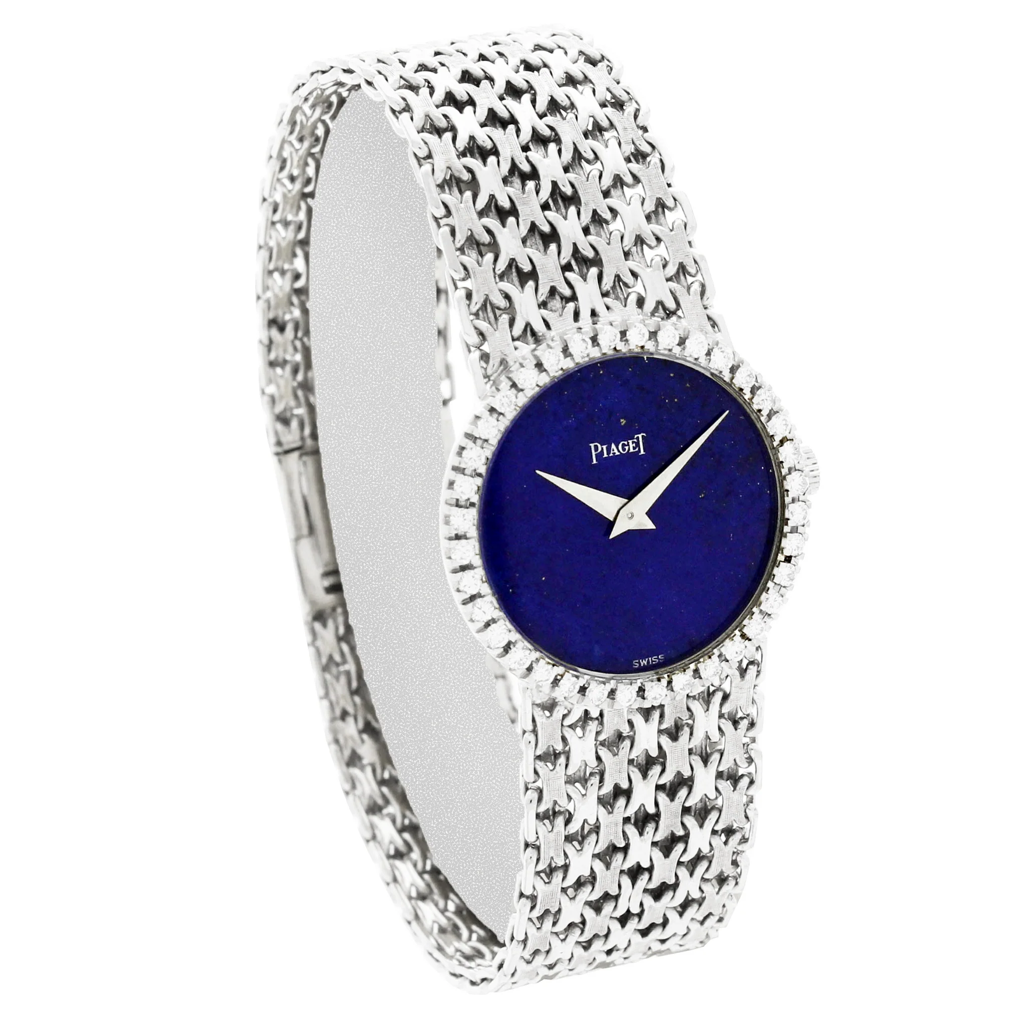 18ct white gold Piaget ref. 926 'round cased' bracelet watch with lapis lazuli dial and diamond set bezel. Made 1970's
