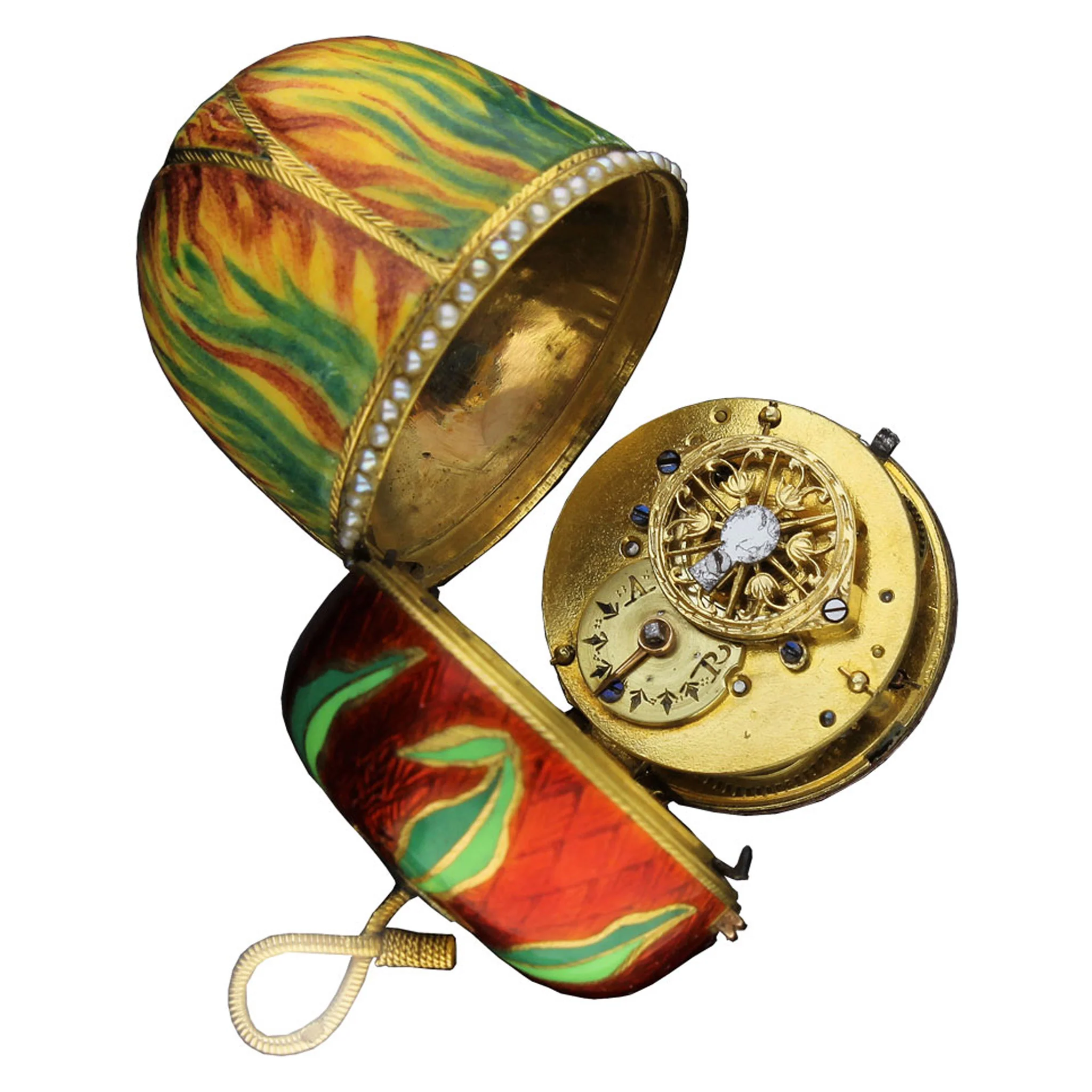 - Features/complications: Multi-coloured enamel and seed pearl set tulip bud shaped case with watch cover with verge movement