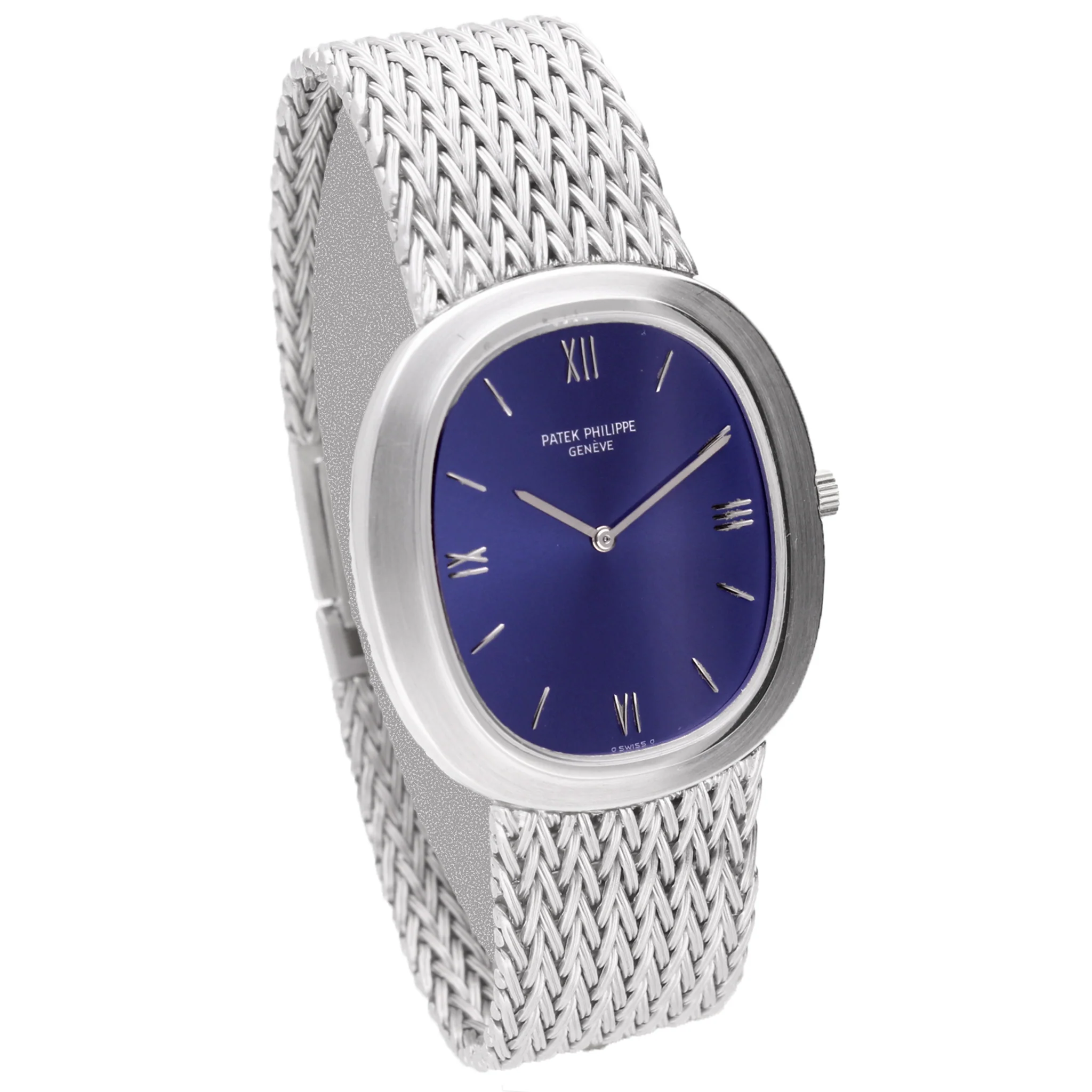 The Patek Philippe Ellipse was created in 1968 with its design inspired by the Golden Section, also known as 'the divine proportion'. The reference 3548 was produced from 1967 until 1976. It was together with Ref. 3546 Patek Philippe's first Ellipse models. The exquisite blue dial on this model is actually made from gold which has been transformed by a special Patek Philippe process to look blue.